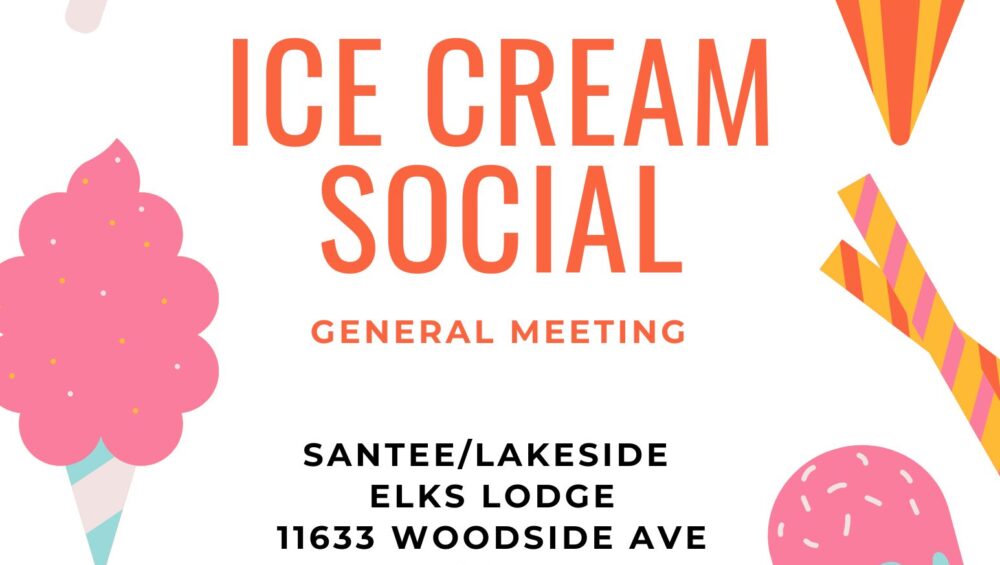You’re invited to join our much anticipated August ICE CREAM SOCIAL General Membership Meeting (always the 3rd Wednesday of the month, 7:00pm at Lakeside Elk’s Lodge, Lakeside, CA).