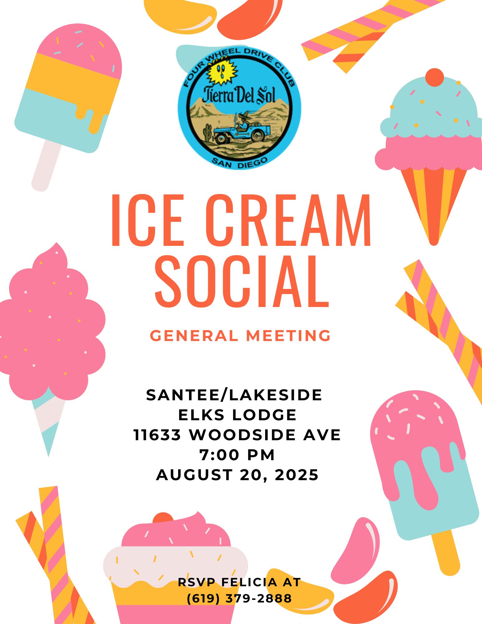 You’re invited to join our much anticipated August ICE CREAM SOCIAL General Membership Meeting (always the 3rd Wednesday of the month, 7:00pm at Lakeside Elk’s Lodge, Lakeside, CA).